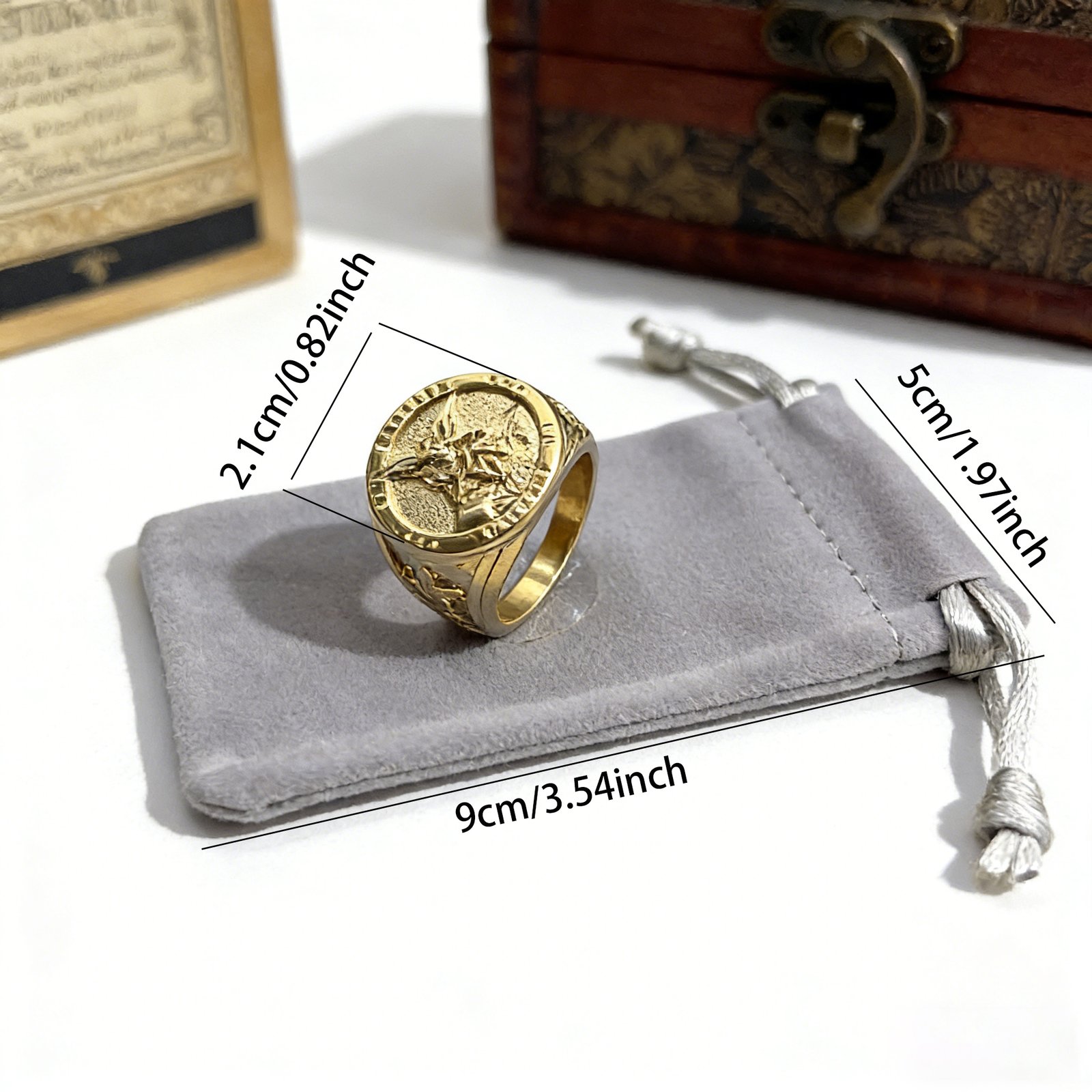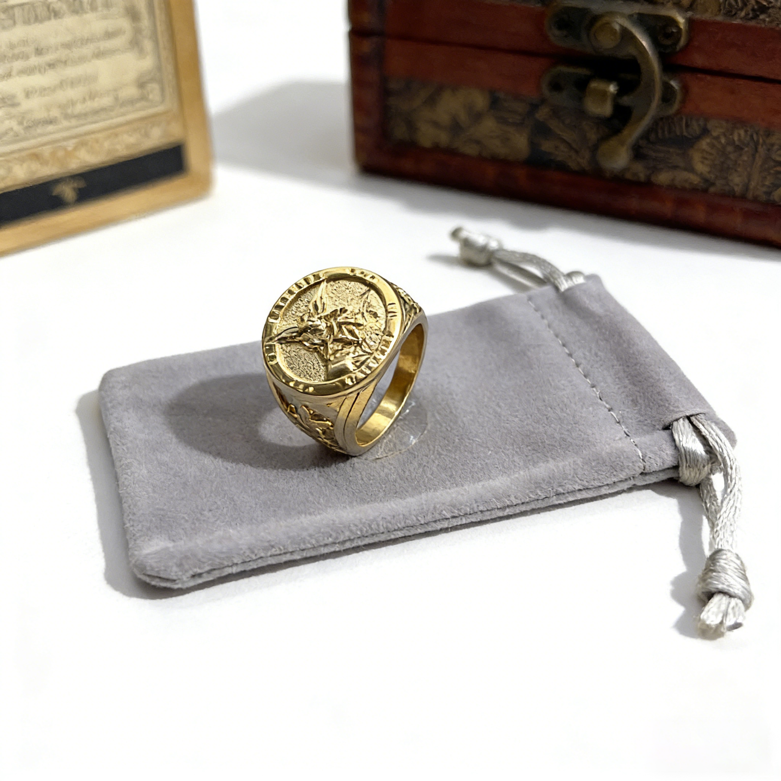 Angel Ring, Archangel Michael themed religious angel ring, elaborately made of high-quality stainless steel. This angel ring is engraved with Archangel Michael protective totem, meaning blessing safety and dispelling darkness, a classic religious faith jewelry. The angel ring is wear-resistant, scratch-proof, fade-proof and hypoallergenic with solemn texture, stable and sufficient in stock. Designed for religious lovers and men, this angel ring is a hot-selling protective angel ring on European and American independent stores, supporting bulk wholesale and distribution.